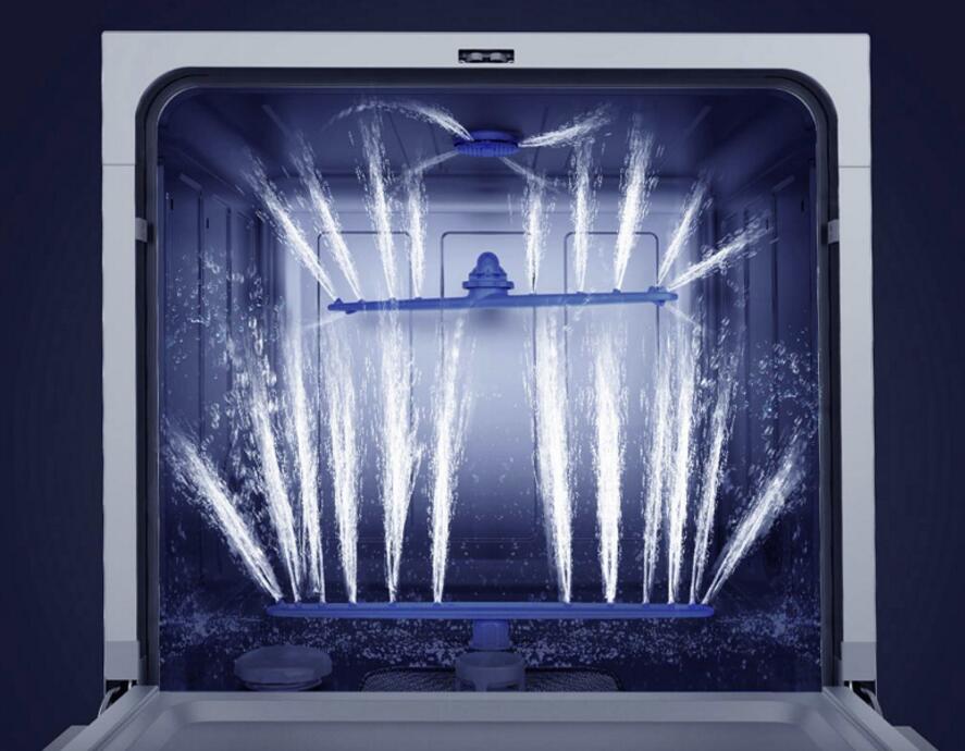 其中,米家互联网洗碗机(8套嵌入式)在普通8套洗碗机喷淋臂的基础上,配置了高端机型特有的顶喷结构,并在28个出水孔中设计了13种出水角度,形成相互交错的360"网状水路,全方位覆盖腔内碗碟。