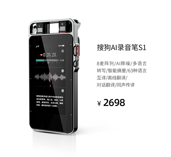 【小熊在线网 新闻报道】2月26日,新一代搜狗AI录音笔S1发布,售价2698元。搜狗AI录音笔S1采用3.5英寸触摸大屏,录音转文字实时可见,同时配备8麦阵列,最远拾音距离可达10米。基于搜狗知音引擎远场识别技术,录音实时转文字准确率达到了98%。支持先录音后转写,可随时将录音转成文字,转写时长为录音时长的1/12。支持63种在线语种翻译,覆盖超过200个国家。支持9种离线语种翻译,包括中文、英语、日语、韩语、法语、泰语、俄语、德语、西班牙语九种语言。