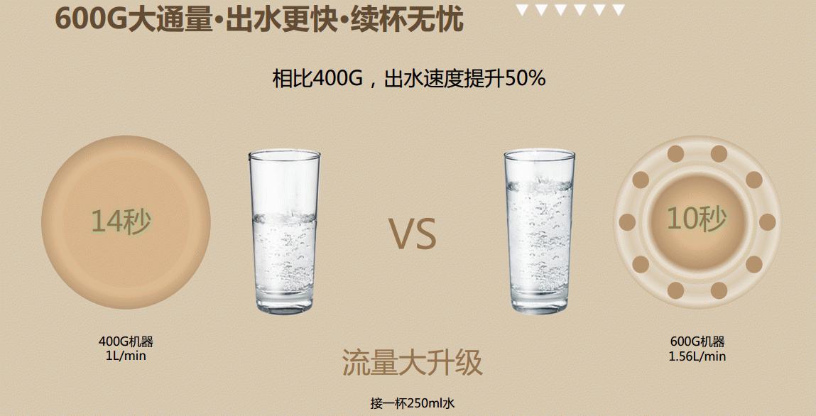 600G大通量是什么概念呢?其意味着净水器的出水更快,相比400G,出水速度提升50%,接一杯250ml水只需10秒钟,每分钟可出水1.56升。