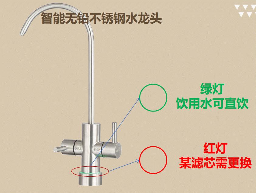 华帝V18 Plus净水器还配有智能无铅不锈钢水龙头,无需担心水龙头含铅而对家人造成伤害。 更贴心是,在水龙头底部可以一目了然看到滤芯状态,绿灯时表示饮用水可直饮,当变为红灯时就提醒我们滤芯需更换了。