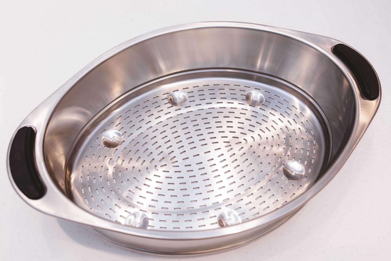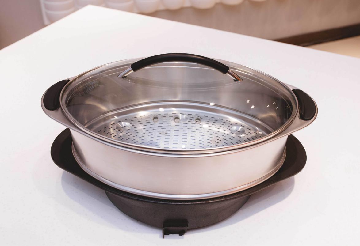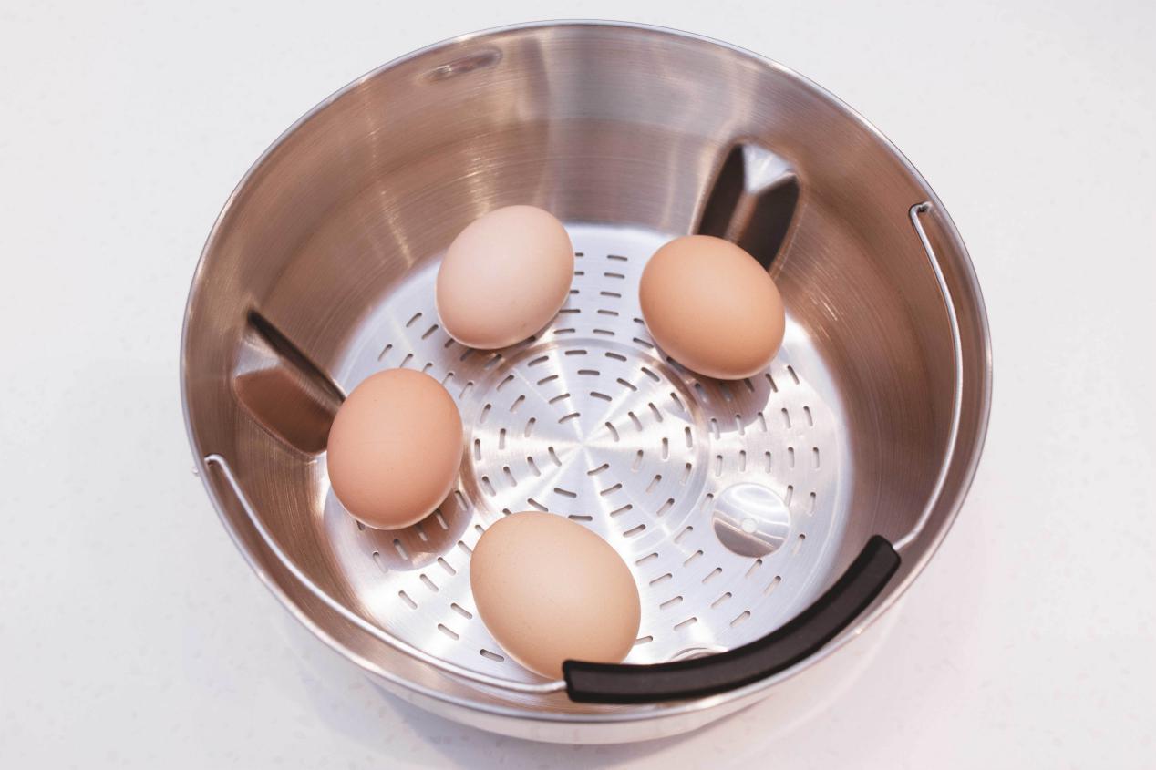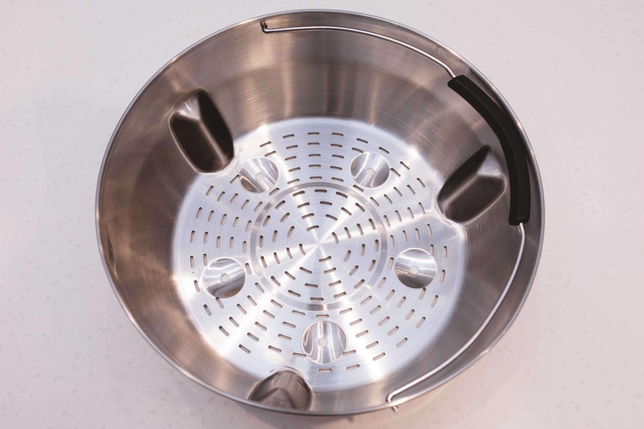 内置蒸锅外围凹槽设计有效配合主锅内三根棱柱,稳如泰山,同样采用不锈钢材质,容量更大,还设计了专门放鸡蛋的槽,方便的手提设计无论是放还是取都很方便。