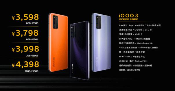 配置上,iQOO 3提供了6G+128G、8G+128G、12G+128G 、12G+256G四个版本可供选择,价格分别对应3598元、3798元、3998元和4398元。同时,全系标配骁龙865+UFS 3.1+LPRRD5顶级硬件配置,在发布会现场跑出61万分的成绩,是市售跑分最快的骁龙865手机之一。