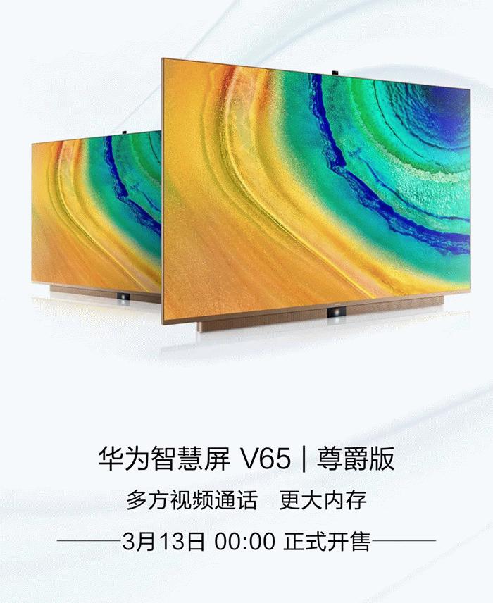 【小熊在线网 新闻报道】华为智慧屏V65尊爵版将于3月13日 00:00正式开售,售价为7999元。华为智慧屏V65尊爵版采用摩卡金配色,65英寸4K量子点屏幕,38 ......