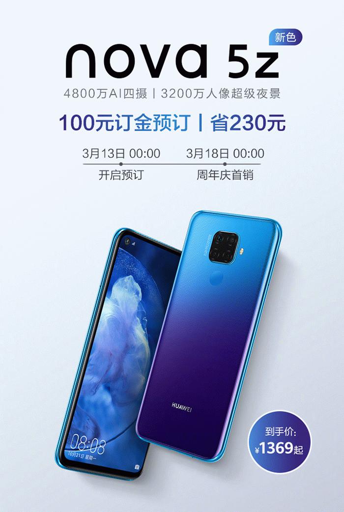 【小熊在线网 新闻报道】华为nova 5z极光色开启预订,将于3月18日正式发售,售价1599元,预订到手价为1369元(6GB+64GB)。nova 5z采用6.26英寸极点全 ......