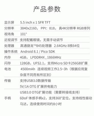 Pico Neo 2硬件配置也进行了全面升级,搭载高通骁龙845处理器,相较上一代产品,性能提升30%,功耗降低20%;采用真4K快速响应LCD屏幕,视场角可达101°,画质更加清晰、细腻、真实; 采用4500mAh后置电池和旋转式绑带设计,满足长时间游戏时的佩戴需求。