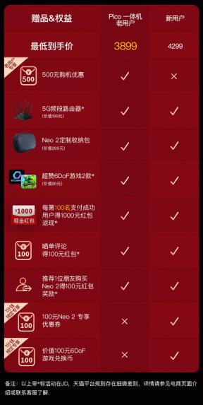 据了解,Pico Neo 2 新品上市定价为4399元,3月16日至24日为预定期,可享1分钱抢100元优惠券+1000P币(价值100元,可在Pico应用商店购买游戏应用)活动;3月25日至27日,新品进行现货开售,届时新用户活动最低到手价为4299元,一体机老用户专享到手价为3899元,每日前100名购买的用户可赢取价值千元的游戏礼包和赠品权益。上述活动在京东天猫平台进行,具体细节可参考对应电商活动介绍。