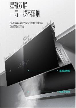 华帝天镜MAX系列侧吸式油烟机采取星幕双屏设计,形成一个宽域跑道式进风口,弧面导烟屏的线型角度、MAX超大拢烟屏的拉伸度和进风口的面积深度,都进一步优化,更符合空气动力学的原理,一导一拢有效减低空气阻力,使得大吸力更为轻松顺畅。