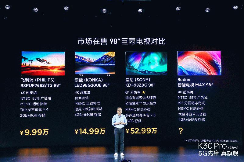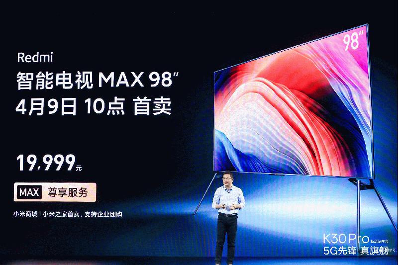 2020年3月24日,Redmi智能电视MAX 98”正式发布,其采用一块98英寸屏幕,实际尺寸比一张单人床还要大。因为其大尺寸的特性,小米还专门为其推出了一站式的尊享VIP定制化送装服务,让购买此款电视的用户完全无后顾之忧。同时它还搭载分区动态背光技术,拥有超高动态对比度,整体显示效果非常出众。Redmi智能电视MAX 98”的售价仅19999元,将于4月9日10点在小米商城和小米之家首卖,并且支持企业团购。