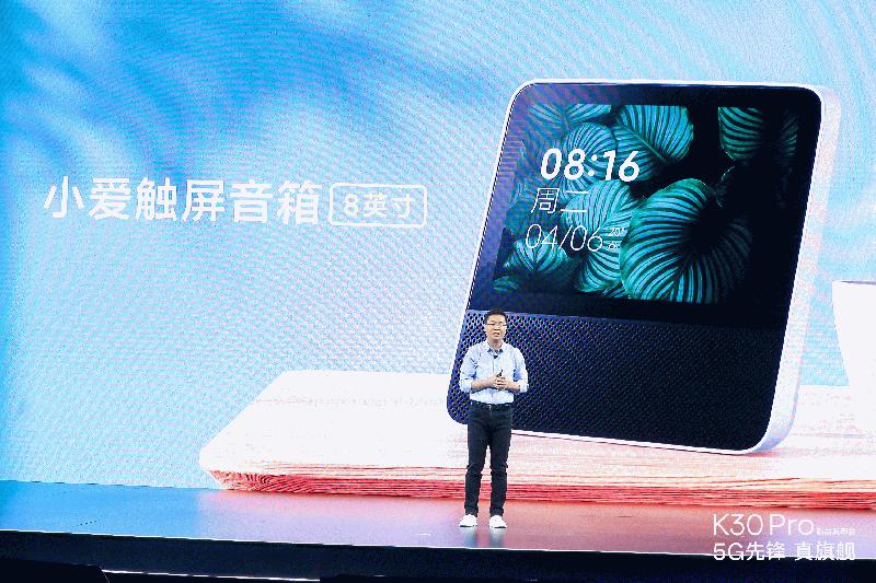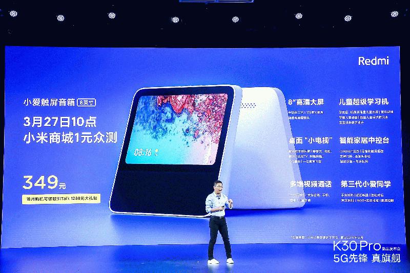 2020年3月24日,小米集团召开Redmi旗舰新品发布会,不仅发布了Redmi K30 Pro 5G系列新品手机,还一同发布了Redmi K30 Pro 5G系列的最佳搭档产品:Redmi小爱触屏音箱8英寸。新款Redmi小爱触屏音箱配备8英寸全贴合高清大屏,覆盖6大视频平台,支持多设备视频通话,智能家居操控,还定制了专属儿童模式,内置第三代小爱同学。