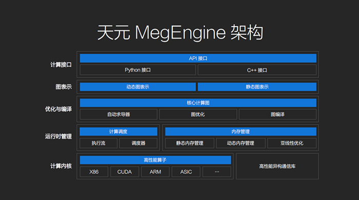 【小熊在线网 新闻报道】3月25日,旷视科技宣布开源新一代AI生产力平台Brain++的核心深度学习框架旷视天元(MegEngine)。天元框架通过训练、推理一体化的机制省去模型转换的过程,可直接将训练后的模型进行推理,并保证跨设备的模型精度对齐,同时天元内置自动模型优化、简化流程,减少因手工操作的机会,降低出错概率。此外,天元配置了Python和C++接口,支持动态图、静态图一键转换和混合编程,可使用高级编程语言进行图优化和图编译。在运行时管理环节,天元具备执行流与调度器,采用动态、静态内存分配并存的方式,并通过自动的亚线性内存管理优化器可以得到更好的内存优化效果;在底层设计上,天元的计算内核兼容主流计算设备,且支持多机多卡和分布式训练。而为了解决模型复现困难的问题,天元则支持 PyTorch Module 导入,可针对计算机视觉任务进行优化。