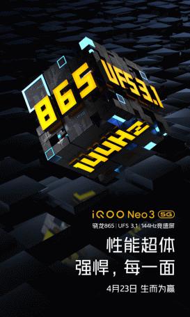 4月13日,iQOO官微正式宣布,全新性能机型iQOO Neo3将于4月23日正式发布,产品理念为“强悍芯生 生而为赢”。而备受关注的三大核心性能配置也同时揭晓:骁龙865处理器、UFS 3.1超快闪存和144Hz竞速屏,合称“性能超体”。如此顶级性能配置组合,引发网友惊叹“iQOO Neo3摊牌了,直接王炸” 、“果然是快到想不到”、“是个狠角色”。