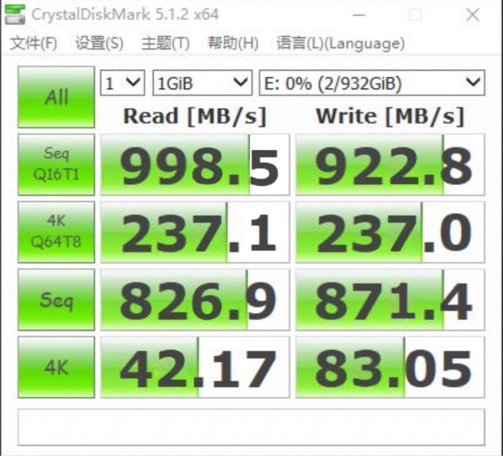 AS SSD Benchmark是专门测试SSD性能的软件。可以测试出固态硬盘的持续读写性能,包括4KB小文件的传输性能等等,显示为MB/S的形式和IOPS形式。WD_BLACK P50硬盘在实际测试中读取速度948.75MB/s,写入速度881.23MB/s,虽然受限于接口,但是该成绩也已经很优秀,由于USB 3.2Gen 2X2接口还在推广阶段,想要更快速度还需要匹配硬件。