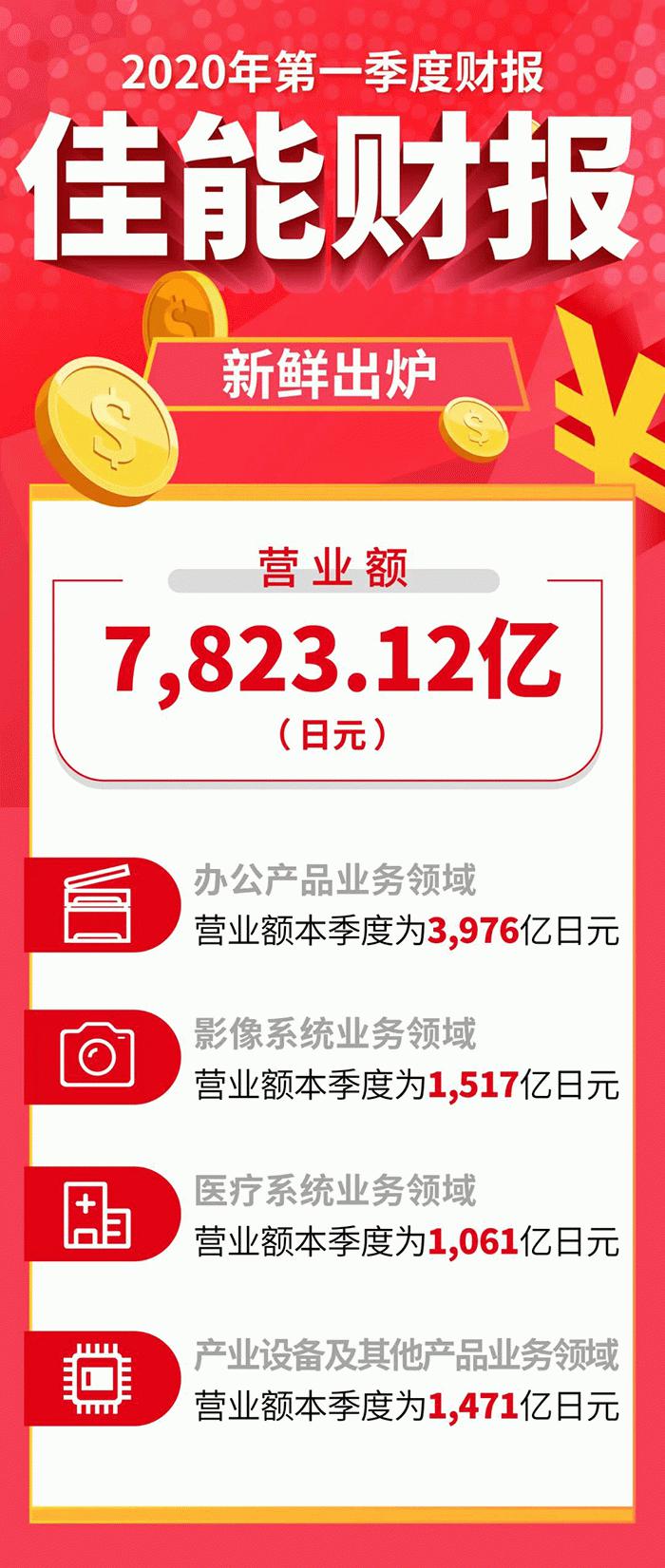 【小熊在线网 新闻报道】2020年4月23日,佳能集团发布2020年第一季度财报。据财报显示,2020年第一季度佳能集团营业额同比降低9.5%,为7823.12亿日元。其中,在新冠肺炎疫情的特殊时期,喷墨打印机和X射线诊断设备的需求量上升,销售台数实现同比增长。此外,网络摄像机市场不断扩大,实现增收。面向生产型数码短版印刷市场的新产品销售表现亮眼。同时,与物联网相关的半导体设备投资表现强劲,销售台数同比增加。
