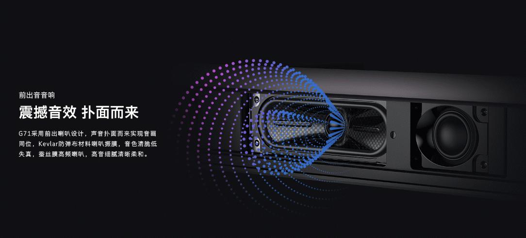 音质方面,创维与全球顶级音响品牌JBL联合调音深度合作,联手将JBL专业级音响带给了创维G71系列。它采用了前出喇叭设计,使用户感受到声音扑面而来,增强临场感。全频喇叭振膜采用凯夫拉防弹布材料,音色清脆低失真。凯夫拉纤维是全球知名材料,最初应用于防弹衣而被世人所认识。得益于其轻量化、强度高、韧性好、耐高温等优秀的综合特性,应用于扬声器振膜上时,在表现大动态、中低频的速度以及低频的能量感上是普通纸质振膜低音单元无法企及的,较小电功率下即可推出很高的响度,复合结构强度极大,在高速震动中还可保持极佳的结构稳定性,表现出极低的失真特性,确保音质的完美还原和声音的良好扩散性。高频喇叭采用蚕丝膜,高音细腻清晰柔和。此外,创维G71系列支持杜比全景声,营造身临其境般的沉浸感。杜比全景声沉浸式音频是继环绕声之后的一大飞跃,全方位震撼的灵动音效将你从平凡时刻带入超凡体验,声音遍布房间,萦绕在你的周围。