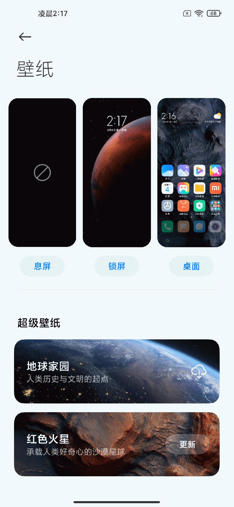 超级壁纸不仅是壁纸,它打通了从息屏状态到锁屏界面再到系统桌面之间的关系,使三者融为一体,解锁流畅的同时带来美感。在系统设置中找到壁纸,上方显示了息屏、锁屏、和桌面可选择静态和动态壁纸,下方的地球家园和红色火星就全新的超级壁纸,超级壁纸也不是单一的动画,我们可以选取落地点,预览效果。