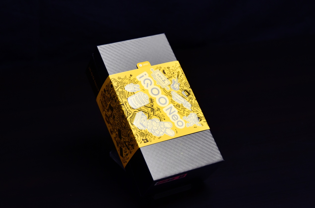 这次iQOO Neo3的包装比较调皮活泼,黄底黑字亮眼的封腰上印有手机的多种亮点,撕下来还是贴纸。