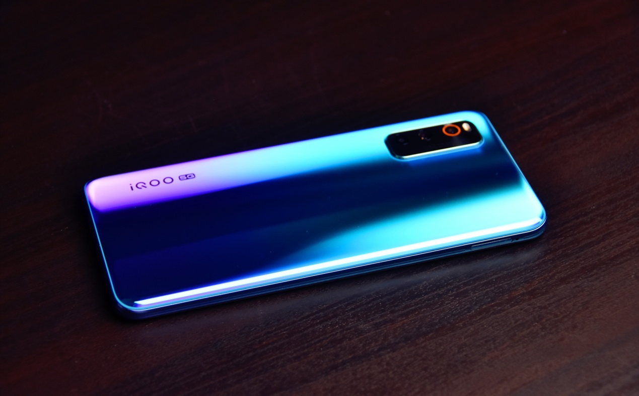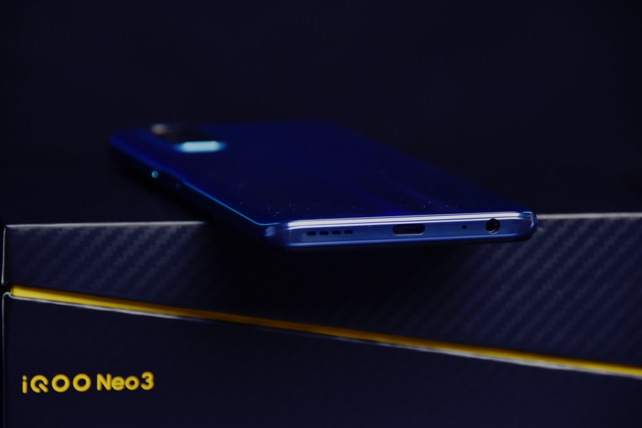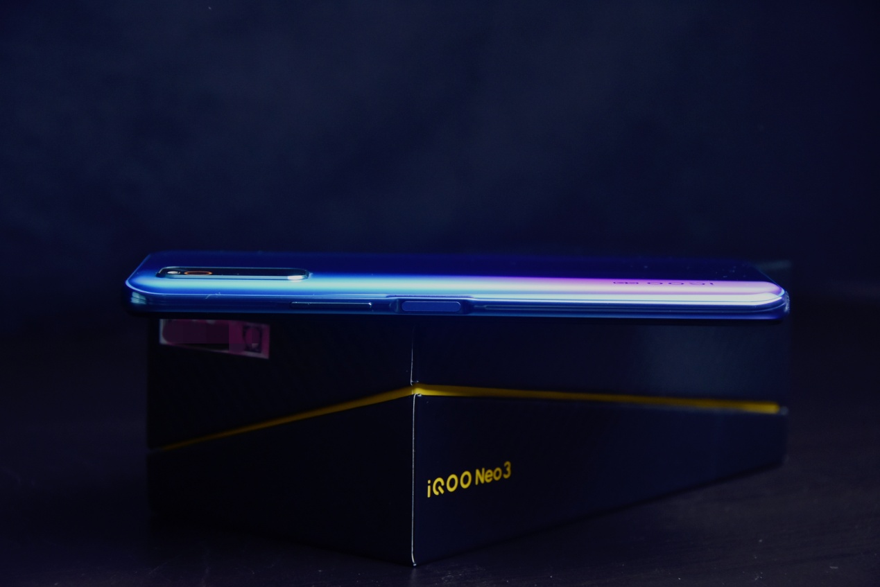 iQOO Neo3拥有青空蓝和夜幕黑两款配色。笔者手中的青空蓝配色由青色紫色和绿色渐变而成,在不同角度下会呈现不同的效果,看起来非常精致。