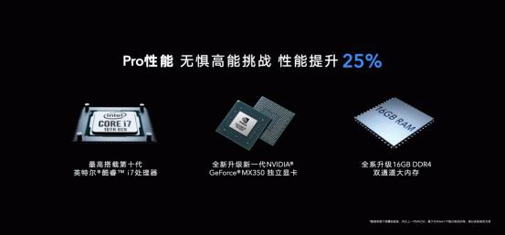 搭配高性能NVIDIA®GeForce® MX350独立显卡,2GB GDDR5 独立显存,性能较上一代MX250独立显卡提升25%;无论是PC图片处理、视频剪辑,还是《英雄联盟》、《DOTA2》、《CSGO》等热门网络游戏,均可轻松流畅运行。最高16GB双通道DDR4大内存和512GB高性能PCIe NVMe SSD高速固态硬盘,应用加载及游戏读取速度更快速;搭载鲨鱼鳍双风扇2.0版本,采用游戏本级别的风扇马达,同时配合双热管设计,实现游戏本级高效散热,确保高负荷运行时持久、稳定运行。