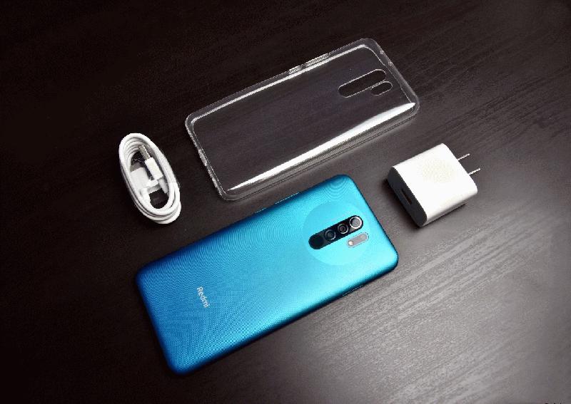Redmi 9的外包装简约时尚,产品型号明显,橙红色点缀具有科技感。包装盒内装有手机主机、电源适配器、透明保护套和Type-C 数据线。