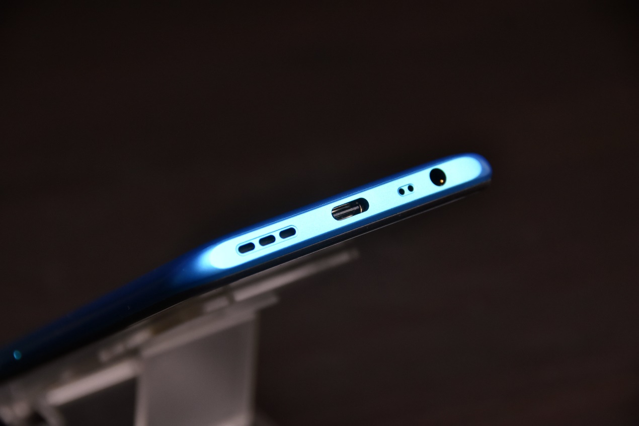 机身右侧是音量调节按键和电源按键,机身底部分别是:独立扬声器、Type-C数据充电口、通话麦克风、3.5毫米耳机孔。