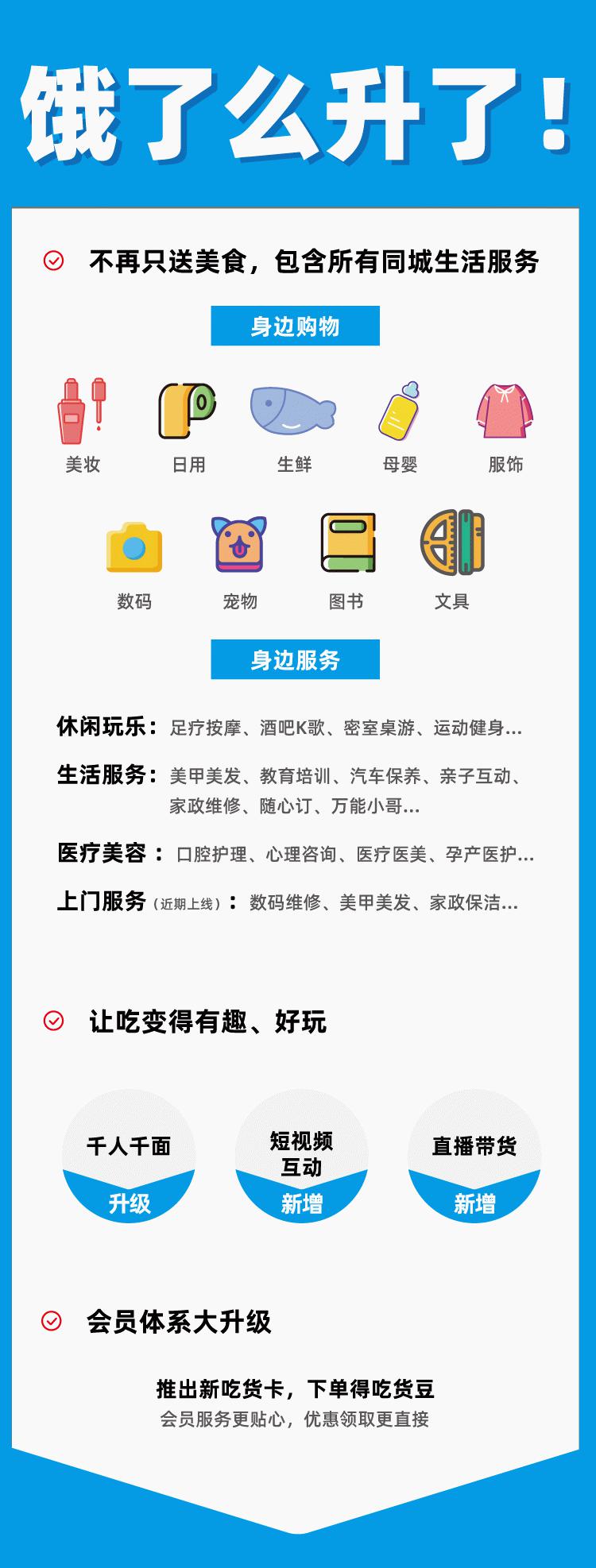 与此同时,饿了么APP将于7月17日全新改版上线。在新版APP中,新版“吃货卡”将成为饿了么新的会员系统,用户在饿了么下单将累积“吃货豆”,吃货豆可兑换红包及商家优惠券。拥有超级会员和新版吃货卡的用户将升级“超级吃货卡”,权益更丰富。新版APP还将大幅增加了内容互动和个性化推荐,推出了名为“真香”的内容平台,平台中有美食图片,也有短视频直播。美食外卖频道和“附近推荐”栏目全新改版,让商家和商品的推荐更加智能。