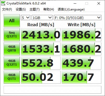 我们用多款软件进行测试,首先闪迪至尊高速 M.2 NVMe 3D 固态硬盘在CrystalDiskMark上的跑分结果:读取速度2413 MB/s;写入速度1986.2 MB/s,和官方数据相差无几,加以其高达 1TB的容量,这样的成绩可以说是相当能打了。