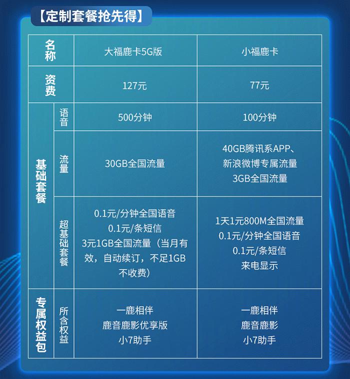 【小熊在线网 新闻报道】7月11日,中国联通携手鹿晗推出“福鹿相伴卡”,并宣布鹿晗正式成为“中国联通创新合伙人”。“福鹿相伴卡”包括“小福鹿卡”和“大福鹿卡5G版”两款组合套餐,资费分别为127元和77元,套餐用户均能享受超多鹿晗"专属权益",如以大容量彩信形式发送的合伙人新鲜资讯;为用户打造的合伙人专属手机炫铃/视频彩铃以及极具特色的AI智能助理服务,帮助用户告别漏话等。此外,"福鹿相伴"公众号作为福鹿相伴卡用户的主要聚集地,也将为用户提供集中化、多选项的定制活动,不仅有引爆粉丝期待的鹿晗演唱会门票,更有获得电影票、实体专辑、官方周边福利以及参与创新合伙人公益项目等一系列新颖好玩的"特色权益"。
