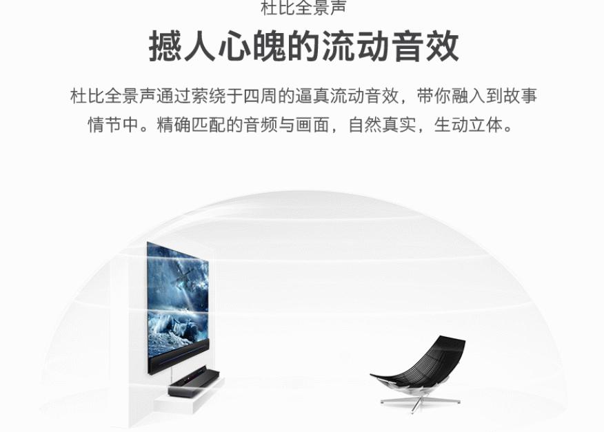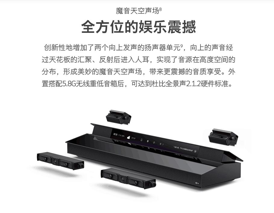 W81 Pro主音箱分布在电视主机盒子内部的左右两侧,朝前发声,在升起的副屏两端则安装了左右两个天空声道,可真实还原声音的方位感。此外,W81 Pro还支持外置无线重低音箱,不仅外观时尚,可以摆放或隐藏于客厅任何地方,创造强劲有力的重低音。同时,得益于扬声器位置的精确布置,W81 Pro在播放杜比全景声影片时,顶置声道与平面声道相结合,最终实现真三维空间声场的环绕声效果。