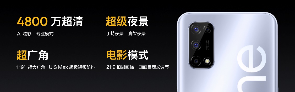 真我V5后置4800万广角四摄,主摄采用f/1.8大光圈4800万像素镜头,支持超级夜景,无论日夜都可轻松拍出好照片;800万像素119°超广角镜头,支持双重防畸变算法,确保画面不变形。同时真我V5支持4K分辨率视频拍摄,前后摄像头均支持EIS视频防抖,还加入全新的电影模式,轻松随手拍大片。