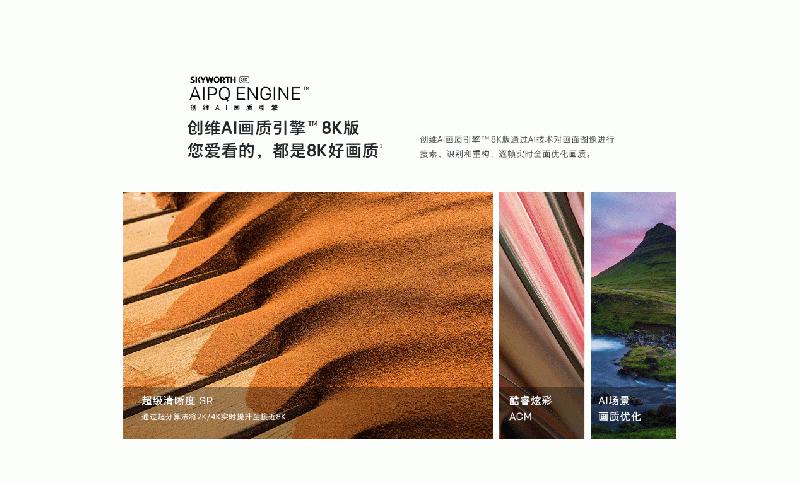 8K内容在带来非凡清晰体验的背后,亦凝结着庞大的数据量。因此,传统电视在传输介质上就无法满足8K内容流畅播放的需求。为此,创维电视Q71系列标配了业内领先的HDMI 2.1有线传输标准和WiFi 6无线传输标准,可保证8K超高清片源在信号接入过程中不会造成数据拥堵。在此基础上,创维电视Q71系列搭载了顶级的MediaTek S900旗舰处理器,不仅支持60FPS的8K解码,还能兼容更多8K格式。该处理器采用A73全大核CPU,搭载6.5GB超大运行内存,内置1.6TOPS强劲算力独立APU,能实时处理解码后的8K图像信号。与之适配的还有创维AI画质引擎8K版。该技术支持AI场景画质优化、酷睿炫彩ACM技术,像素级优化画质,让色彩更加真实自然。同时,创维AI画质引擎8K版还支持超级清晰度SR技术,可通过超分算法将2K/4K片源实时提升至接近8K级别,不辜负这块顶级的8K显示面板。