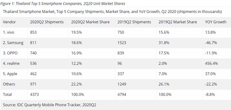 10月14日,国际权威调研公司IDC公布的最新报告显示,2020年第二季度,泰国智能手机市场出货量430万台,环比增长21.2%,但同比下降8.8%。其中,中国智能手机厂商vivo以19.5%的市场份额排名第一。