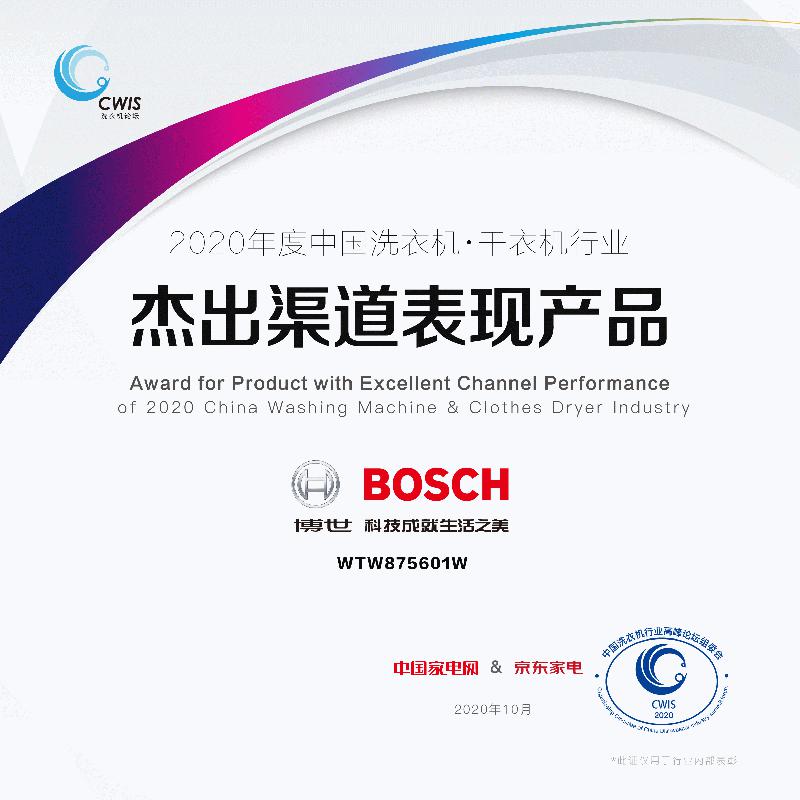 博世干衣机WTW875601W则获评“2020年度中国洗衣机·干衣机行业杰出渠道表现产品奖”。该产品可通过65℃除菌烘干对衣物进行物理杀菌,除菌率高达99.9%。此外,博世干衣机WTW875601W所搭载的冷凝器自清洁技术,还可实现智能三维冲刷,无需手动清洁产品,即可时刻保持洁净。
