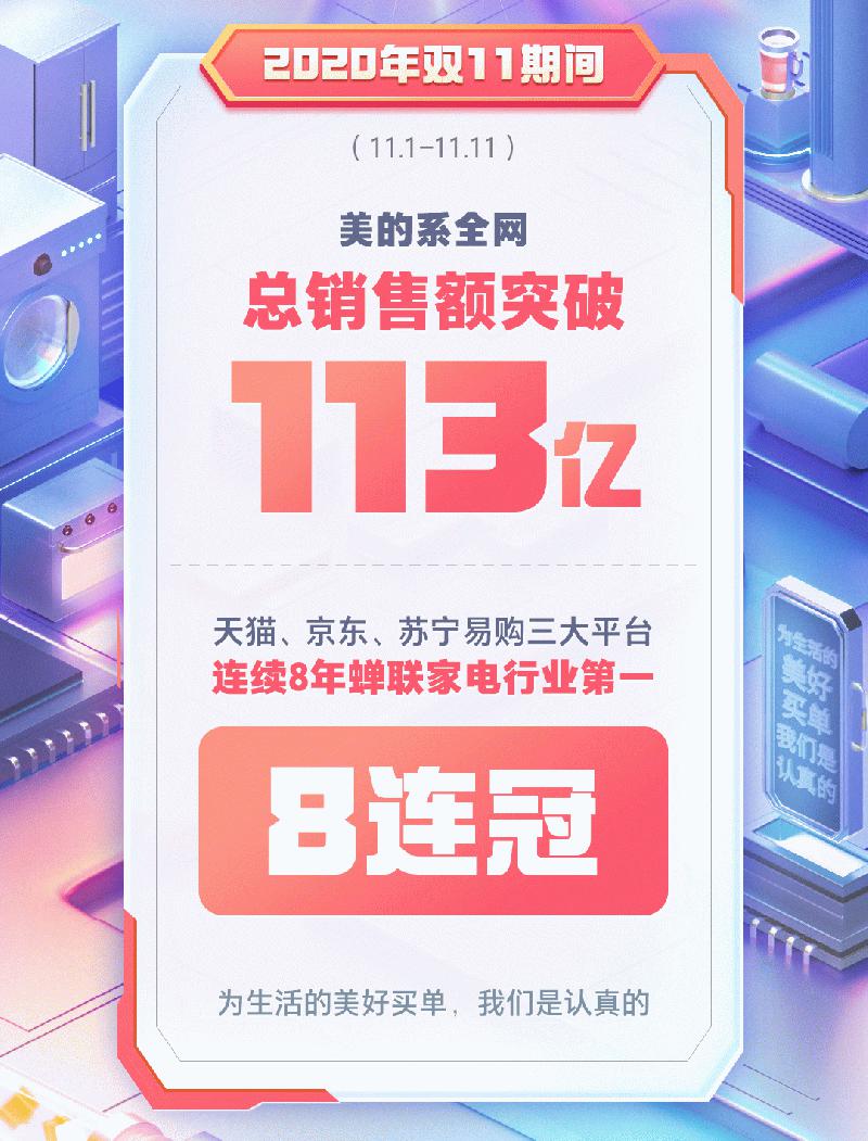 美的双11销售额突破113亿 连续8年蝉联家电行业第一