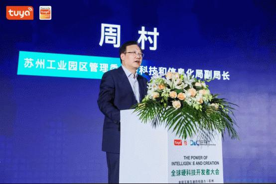 苏州工业园区管理委员会科技和信息化局副局长周村为大会开幕致辞。他表示:“苏州是制造大市也是强市,工业产值去年3.4万亿,位列全国第一,为产业转型升级提供了良好的基础和广阔的空间。而制造业升级离不开信息技术,为此,苏州工业园区大力发展以人工智能为引领的信息和产业集群。欢迎涂鸦智能等领先的AIoT企业参与苏州数字化建设,共同推进苏州工业互联网和人工智能产业蓬勃发展。”