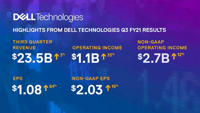 戴尔科技集团公布2021财年第三季度(2020年8月-2020年10月)财报。第三季度,总营收同比增长3%,达到235亿美元。运营利润为11亿美元,同比增长35%,non-GAAP运营利润为27亿美元,同比增长12%。其中净利润为8.81亿美元,non-GAAP净利润为17亿美元,调整后的EBITDA(即未计入利息、税项、折旧及摊销的净利润)为32亿美元。