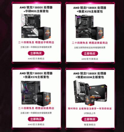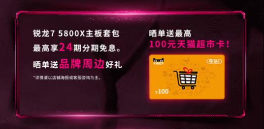 而在天猫AMD官方旗舰店,AMD则为大家准备了不同的活动,活动时间为12月7日 -12月12日,在活动期间,购买锐龙7 5800X主板套包不但可以最高享受24期分期免息的活动,在收货后进行晒单还能获赠品牌周边好礼以及价值100元的天猫超市卡,可以说是福利满满 。