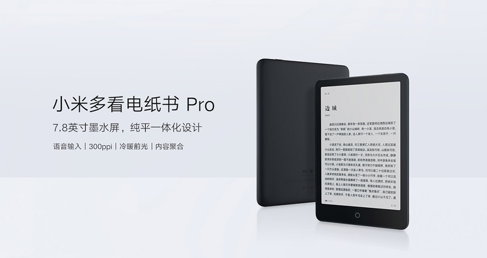 小米多看电纸书Pro正式开售,零售价1299元。小米多看电纸书Pr 重251克,厚7mm,采用7.8英寸墨水屏,1872×1404分辨率,300ppi屏幕像素密度。搭载4核处理器,2GB内存+32GB存储,24级双色温阅读灯。内置多看阅读,支持微信读书,内置语音搜书功能,还可自动定位关键词。有多种书库导入方式: 百度网盘、多看网盘、WLAN传书、USB连接电脑、蓝牙传书等,并且支持PDF重排。上线搜狗输入法,支持语音、拼音、笔画、五笔、英文输入,适配墨水屏的刷新速度。有青少年模式,精选教育知识类内容。