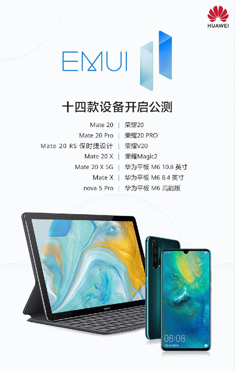 12月25日,华为宣布,14款手机、平板设备开始公测EMUI 11。具体机型包括:Mate 20、Mate 20 Pro、Mate 20 RS保时捷设计、Mate 20X、Mate 20X 5G、Mate X、nova 5 Pro、荣耀20、荣耀20 Pro、荣耀V20、荣耀Magic 2、华为平板M6 10.8英寸、华为平板M6 8.4英寸、华为平板M6高能版。其中,荣耀机型将升级为Magic UI 4.0。公测结束后,会分批次首先为公测用户推送正式版本,且不会清除数据。