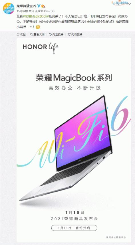 全新MagicBook将于1月18日正式发布 WiFi-6成亮点