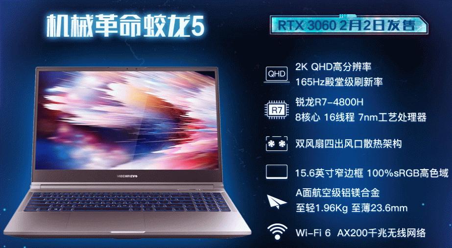 蛟龙系列游戏本是机械革命今年的销量基石,凭借搭载了NVIDIA GeForce RTX 3060笔记本电脑GPU,性能再获突飞猛进式的升级。15.6英寸的窄边框设计屏幕具有100%sRGB的高色域覆盖,并且高达240HZ刷新率的电竞屏让电竞玩家更快获得制胜先机。蛟龙5游戏本采用了锐龙7 4800H八核心十六线程处理器,配合16GB双通道DDR4 3200高频内存和512GB大容量NVMe协议固态硬盘可以提供可以获得畅快的游戏体验。