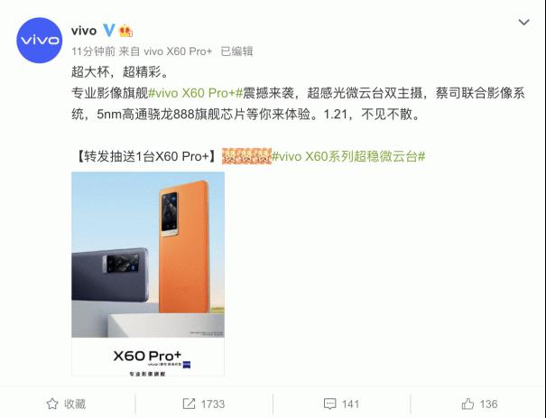 今天,vivo官方微博发布一张海报,把即将发布的vivo X60 Pro+“超大杯”的硬核配置曝光:超感光微云台双主摄、蔡司联合影像系统、5nm高通骁龙888旗舰芯片等配置,这让本来就人气颇高的X60 Pro+更加火爆。1月21日,也就是后天,vivo X60 Pro+将正式发布,届时,更多产品细节将会全部曝光。