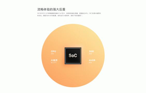 和任何电子设备一样,硬件配置对电视的性能有着举足轻重的影响。创维Q70搭载最新8K Soc芯片,四核高性能处理器,搭载独立APU,专门负责AI画质实时优化。同时,产品搭配3GB+64GB配置,可以轻松运行大型软件,切实满足用户所需。