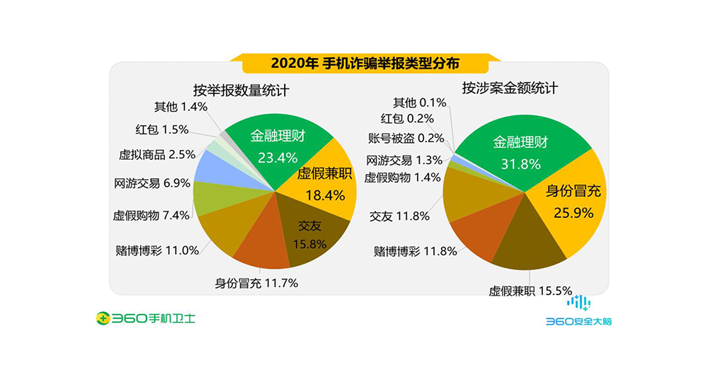 2020年全年,360手机先赔共接到手机诈骗举报2656起。其中诈骗申请1340起,涉案 总金额高达1520.2万元,人均损失11345元。在所有诈骗申请中,金融理财占比最高达 23.4%;其次是虚假兼职(18.4%)和交友(15.8%)等。从涉案总金额来看,金融理财类诈 骗总金额最高,达482.9万元,占比31.8%;其次是身份冒充诈骗,涉案总金额393.2万元,占比25.9%;虚假兼职排第三,涉案总金额235.5万元,占比15.5%。