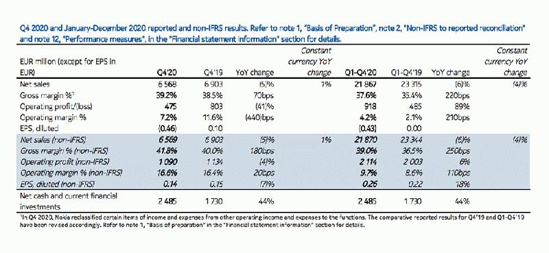 2月4日,诺基亚公布了2020年第四季度以及全年财报。财报显示,按IFRS会计准则计算,2020年第四季度净销售额65.68亿欧元,同比下降5%;2020全年净销售额219亿欧元,同比下降6%。从收入组成上看,诺基亚的网络业务占销售收入的绝大部分,第四季度占比77%。利润方面,第四季归属于母公司股东的净亏损为26.01亿欧元,而去年同期实现净利润5.63亿欧元。第四季度销售额的下降原因是移动网络部署和规划服务的下滑。