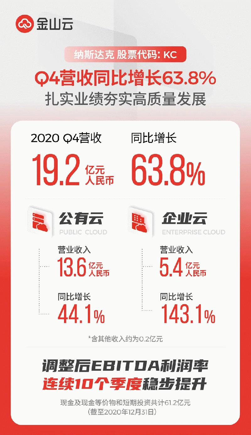 金山云2020年Q4营收19.2亿元 同比增长63.8% ......