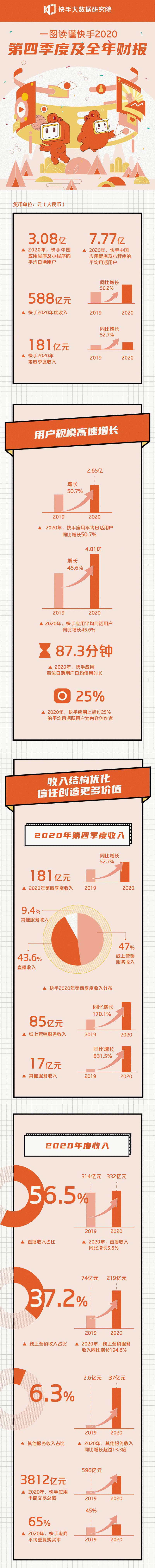 3月23日,快手(01024.HK)上市后首次公布业绩。2020年,快手中国应用程序及小程序平均日活3.08亿、月活7.77亿。快手应用平均日活及月活分别为2.646亿、4.811亿,同比分别增长50.7%和45.6%。2020年快手收入588亿,较2019年增长50.2%。快手应用电商交易总额达3812亿,同比增长539.5%。2020年第四季度,快手线上营销服务收入实现迅猛增长,单季收入85亿,超越2019年全年。
