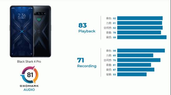 黑鲨4 Pro的音频规格包括可立体声播放的完全对称双扬声器设计(顶部和底部),还有用于音乐、电影或游戏的特定调试功能。有3.5毫米的耳机插孔,这对游戏和音乐发烧友来说相当好用。DXOMARK音频测试套件,对黑鲨4 Pro进行测试,通过内置的麦克风录制声音以及内置的扬声器播放音频,评估其性能。