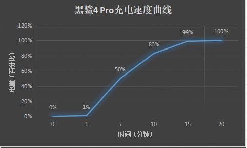 经过实测,黑鲨4 Pro从电量0开始充电,5 分钟充至 50%,10 分钟充至 83%,在不到 15分钟内几乎充满 100%电量(4500mAh),这么优秀的成绩体现了它的极致水平和优势。