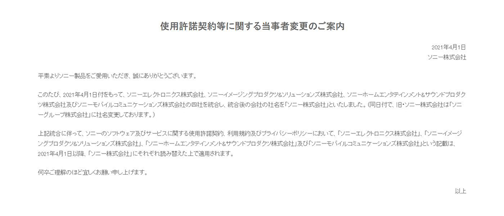 索尼公司宣布,将于4月1日正式将原公司名称索尼公司(Sony Corporation)将更名为“索尼集团公司”(Sony Group Corporation)。索尼电子公司,索尼影像产品和解决方案公司,索尼家庭娱乐和音频产品公司以及索尼移动通信公司将合并入“索尼公司”,同日,“索尼公司”正式更名为“索尼集团公司”。