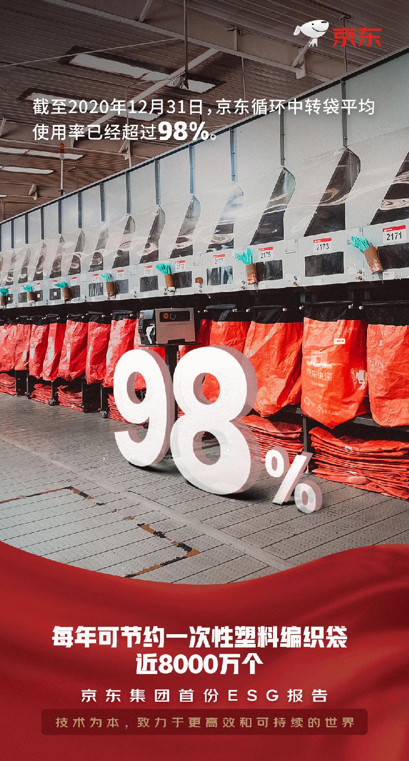 在“与环境共生”的理念下,京东持续尝试用多种方式使物流更可循环和低碳。通过使用循环中转袋替换一次性编织袋,用循环缠绕网/扎带替代缠绕膜来减少塑料制品的使用。截至2020年12月31日 ,京东循环中转袋平均使用率已经超过98%。
